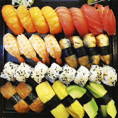 2x Nigiri (Tofu), 2x Nigiri (Omlett), 2x Nigiri (Avocado), 4x Nigiri (Lachs), 4x Nigiri (Thuna), 4x Nigiri (Ebi), 4x Nigiri (Unagi), 8 Inside Out Tempura, Ebi